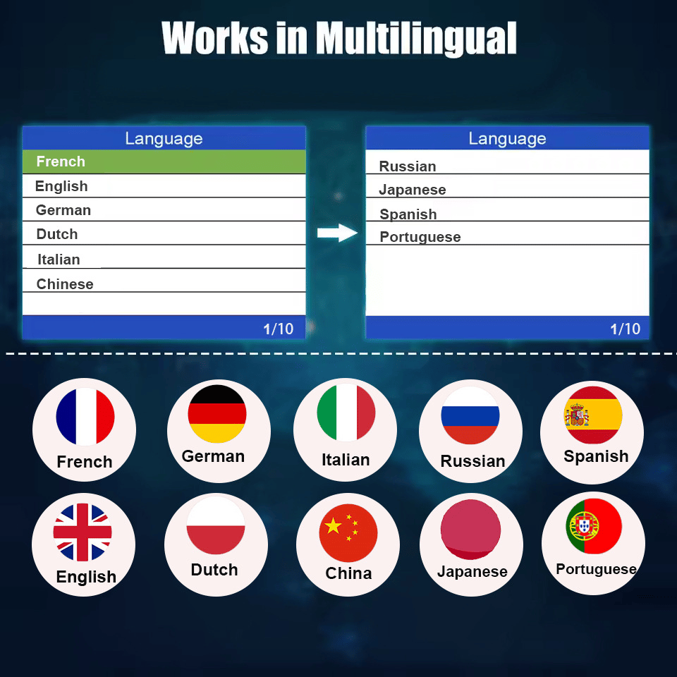 Suporte multilíngue: inglês 🇺🇸 | francês 🇫🇷 | espanhol 🇪🇸 | italiano 🇮🇹 | holandês 🇳🇱 | português 🇵🇹 | inglês britânico 🇬🇧 | alemão 🇩🇪 | japonês 🇯🇵 | chinês 🇨🇳