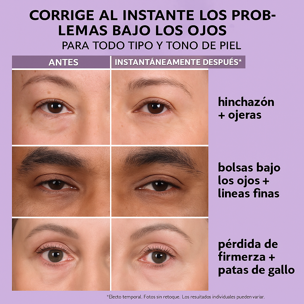 Resultados instantáneos – Reduce hinchazón, arrugas y bolsas bajo los ojos en minutos.